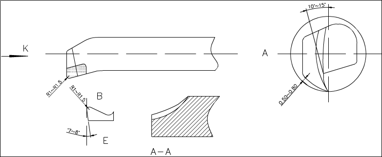 研削時、前の角は10-15°の弧角まで丸められ、後の角は加工弧(工具の底線に沿って弧)に基づいて壁から0.5-0.8 mm離れている。 cの切削刃角はk方向に§0.5−1、切屑刃に沿ったB点はR 1−1.5である。 副後角は7〜8°に研磨するのに適している。 E内縁の点A−Aは、破片を外に排出するために円形に研磨される。